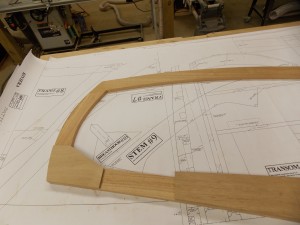 - November 5, 2015 - Rough cut the Stem and Breasthook. Laid out and final cut (1) Stem piece . 1 hour