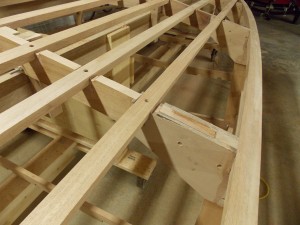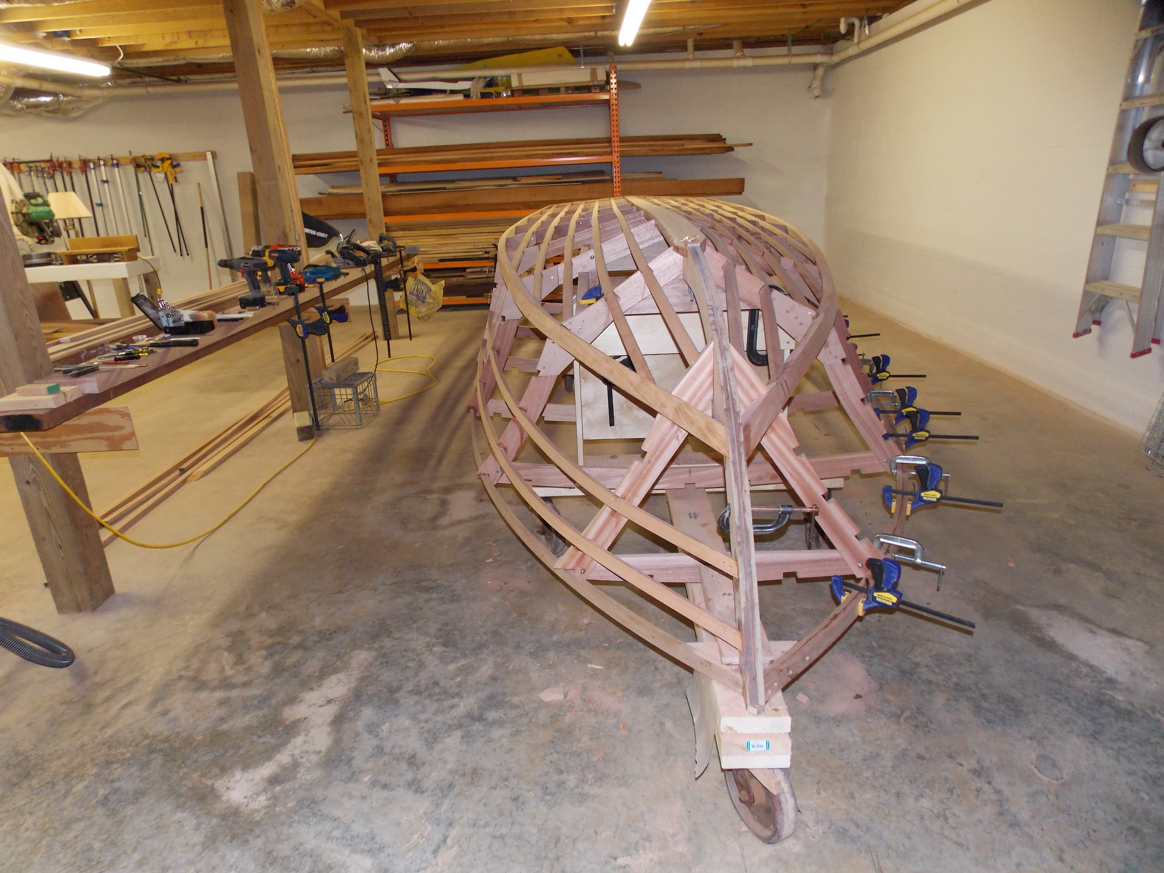 A view from the aft end. I found it easier to make the batten splices when installing on the frame. Note the clamps at frame #3.