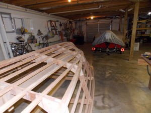 January 2, 2016 - Installed the port side sheer second lamination and the starboard side first side battens. 1 more lamination for each side on the sheer and (2) more side battens to install. I am ready to move onto fairing. 3 Hours.