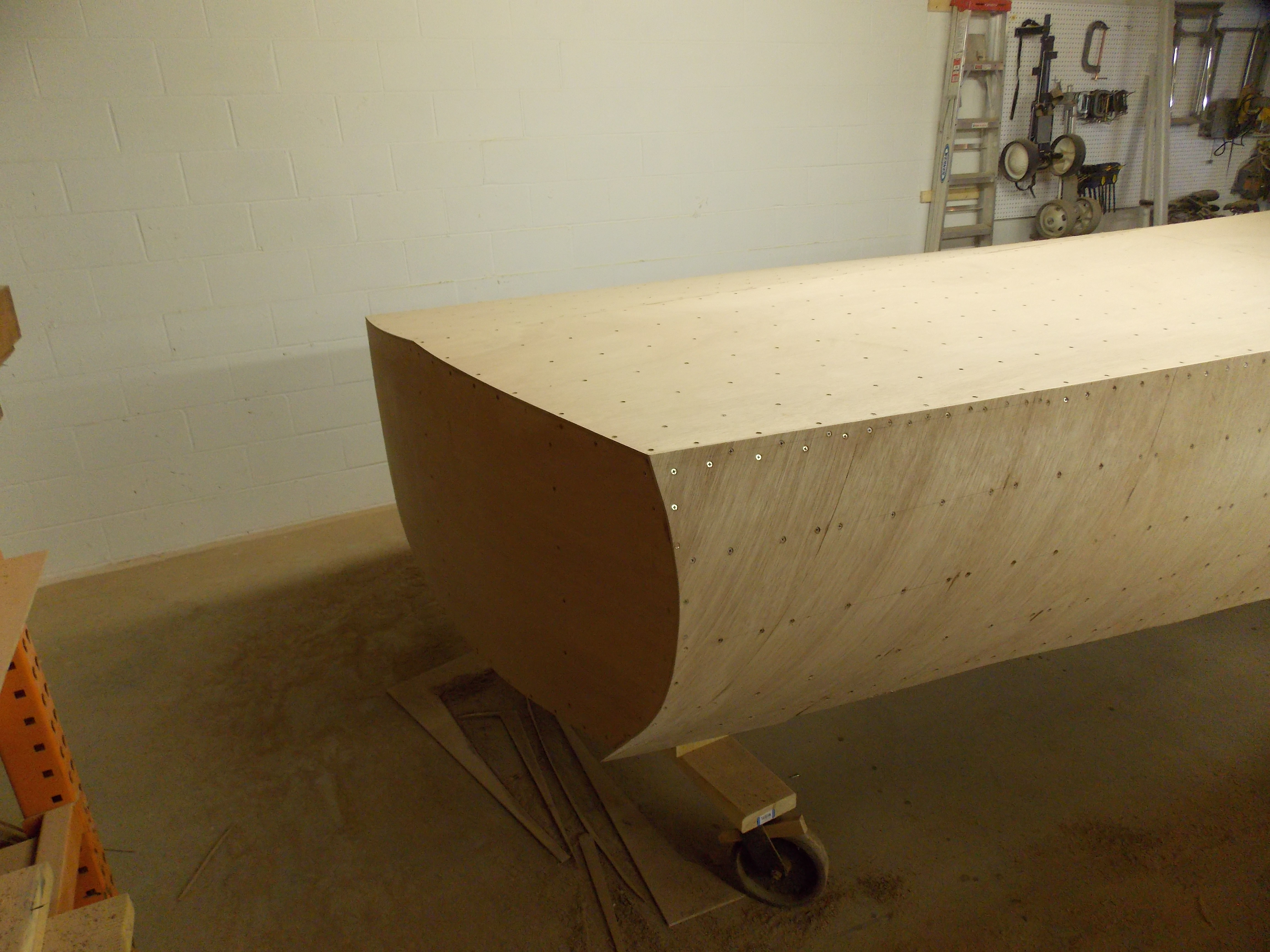 Second layer of plywood attached at the aft end. Note: The second piece is cut at a 45 degree angle in the opposite direction of the first layer.